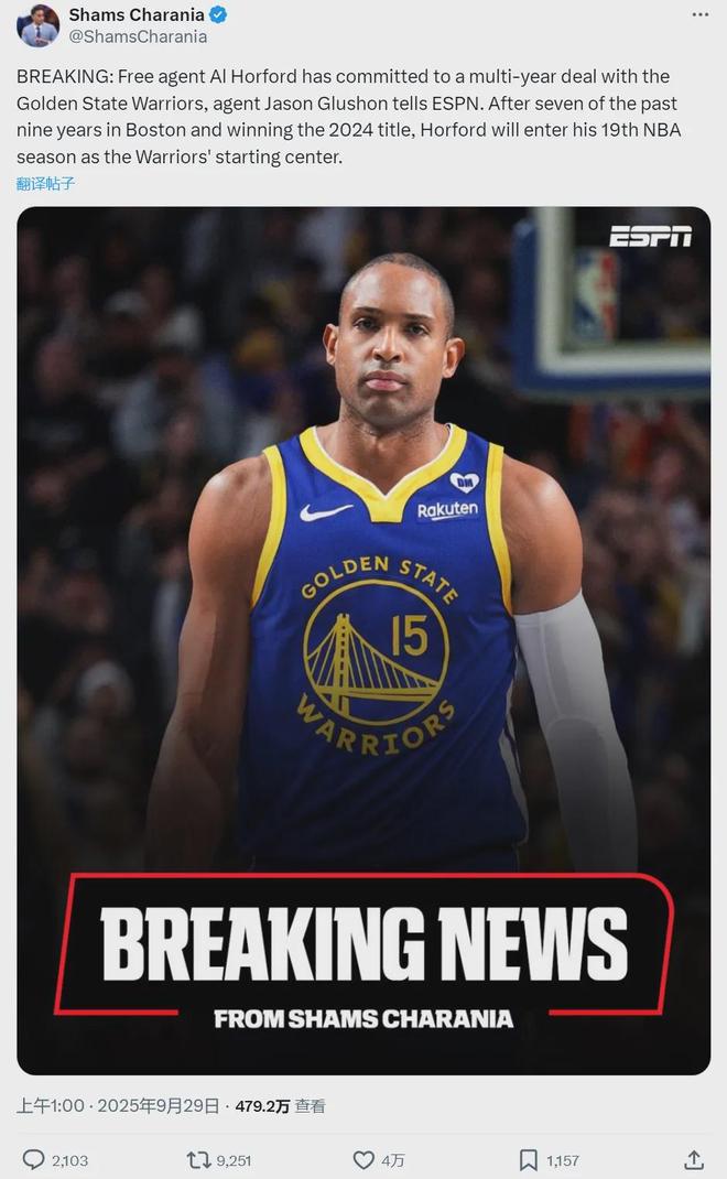 直播吧9月29日訊 據ESPN名記Shams報道,艾爾-霍福德已承諾與勇士簽訂一份多年合同 ,他將以勇士隊首發中鋒的身份開啟個人第19個NBA賽季。名記Marc Stein跟進報道稱霍福德無法參